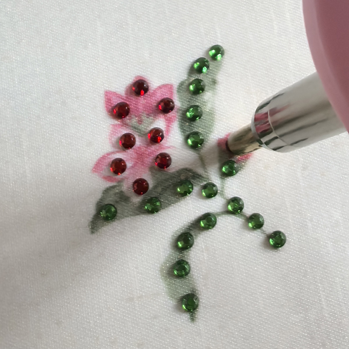 - 在有印花的面料上(普通印花,油印胶印的印花上无法烫钻,烫不住,一摸就会掉),可以选取恰当颜色沿着印花的边线,等距离烫钻。印花如果较小,可以烫在印花的中心。如图这种,绿色烫钻可以沿着叶柄和叶子边缘烫钻。粉色的可以烫在每个花瓣中心